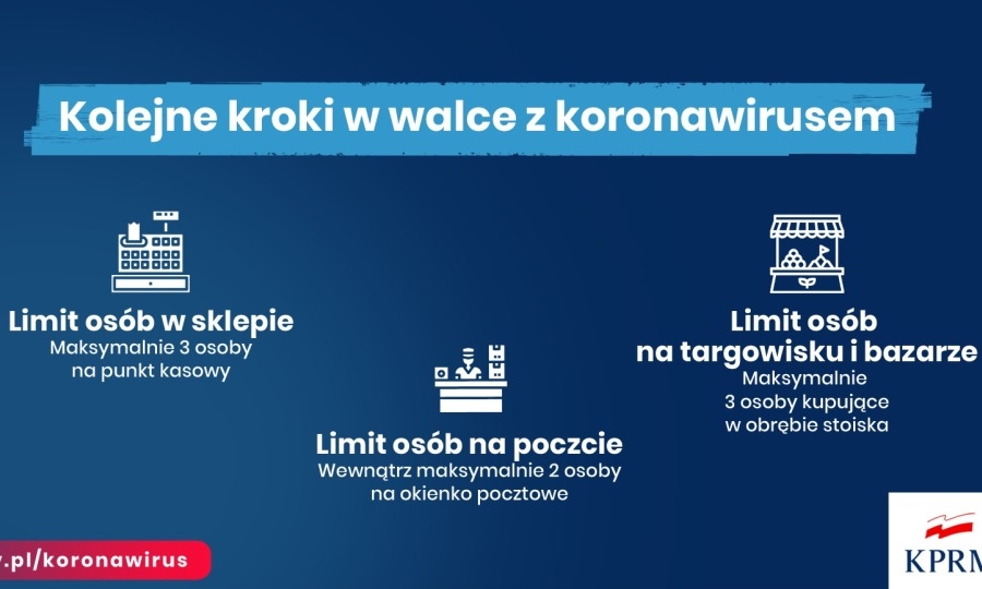 - wprowadzony zostaje limit osób przebywających w sklepach - maksymalnie 3 osoby na jedną kasę (na pocztach limit ograniczono do 2 osób na jedno okienko);