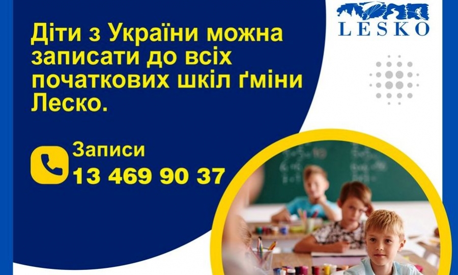Осіб, що приїхали з України, які перебувають у районі ґміни Леско, заохочуємо до реєстрації дітей до 14 років для продовження навчання у класах нашої початкової школи.