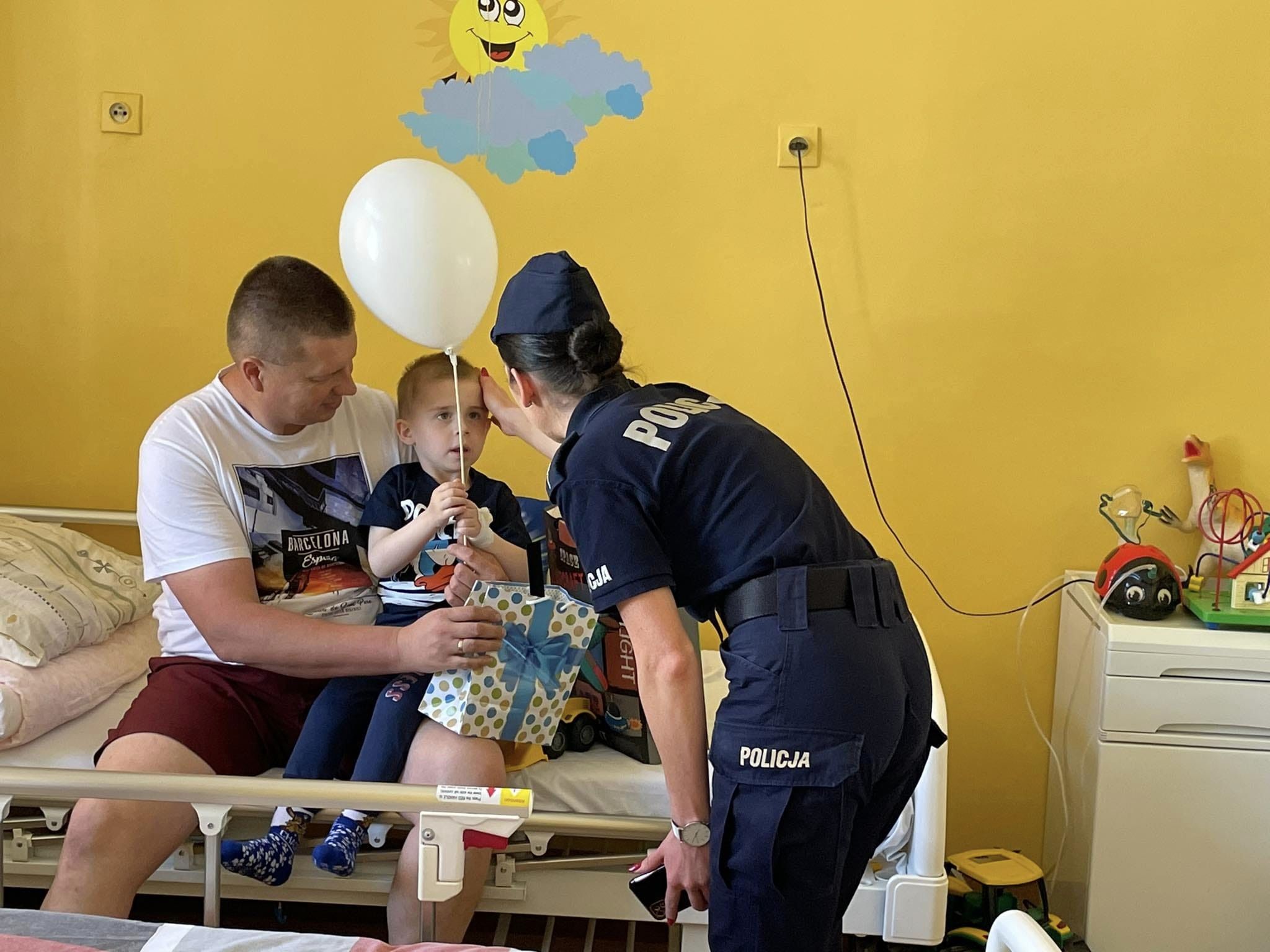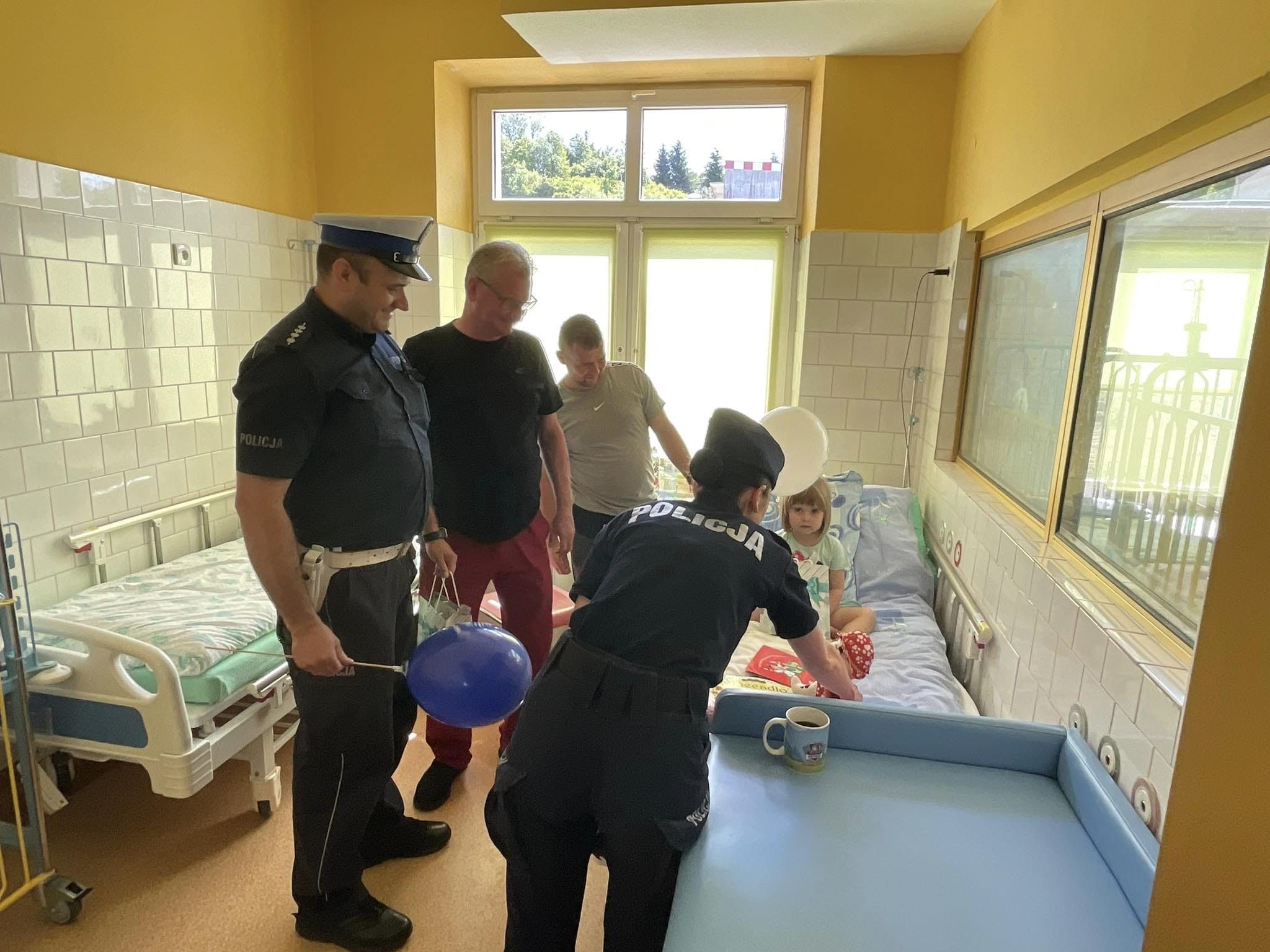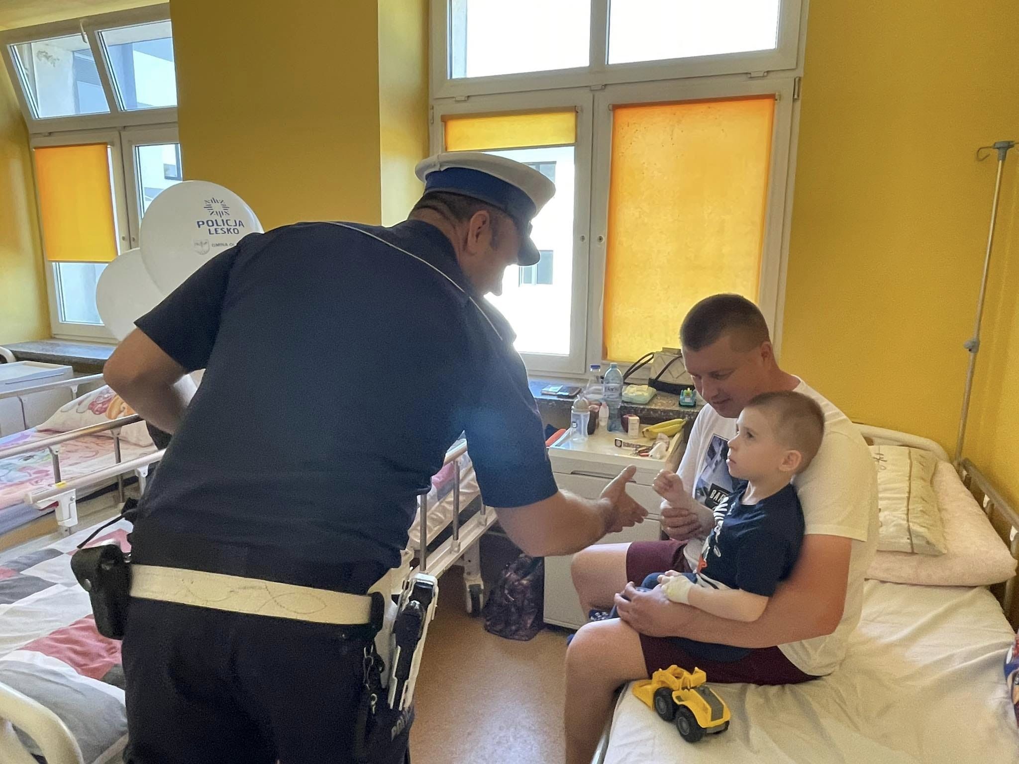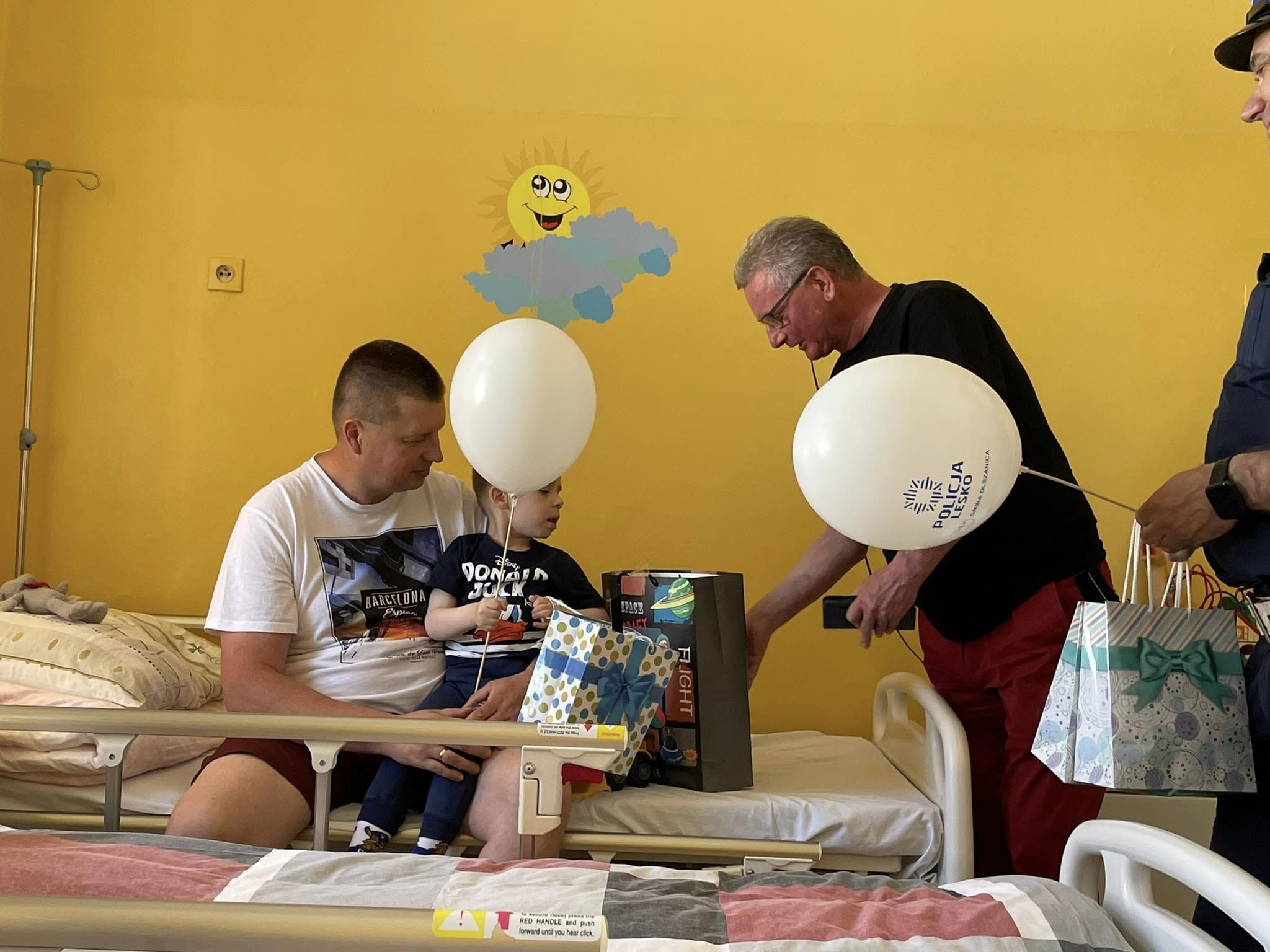 LESKO, PODKARPACIE. W czwartek, 1 czerwca Oddział Dziecięcy Szpitala Powiatowego w Lesku odwiedzili funkcjonariusze Komendy Powiatowej Policji w niezwykłej roli "prezentowych kurierów". Dzięki hojności sponsorów - firmy Eurocash i ABC "U Sowy" - którzy ufundowali okolicznościowe upominki, policjanci mogli wręczyć wszystkim małym pacjentom prezenty z okazji Dnia Dziecka.
